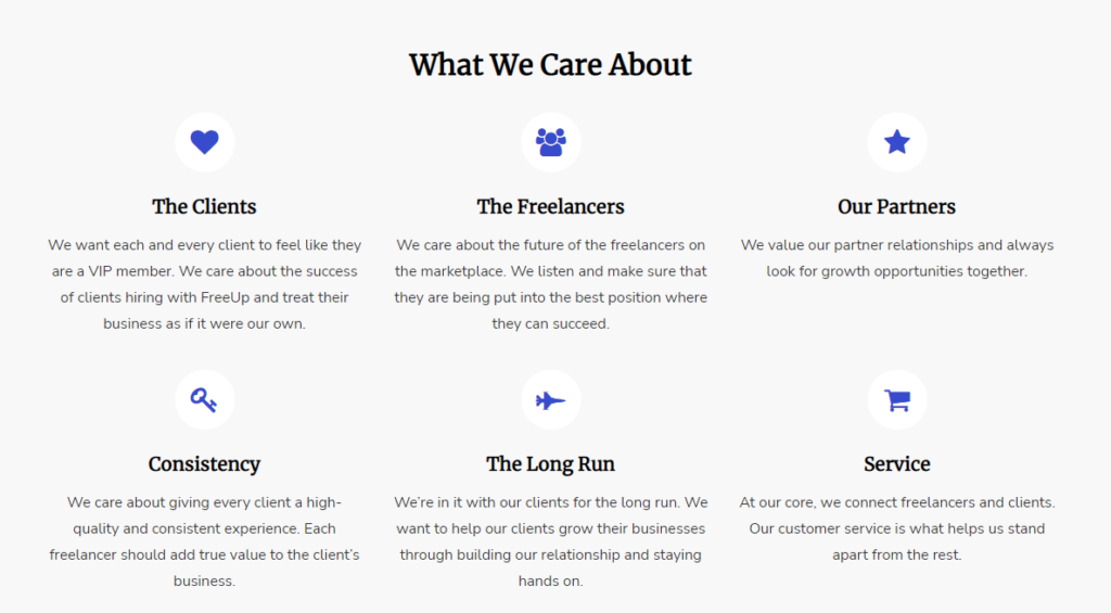 We want each and every client to feel like they are a VIP member. We care about the success of clients hiring with FreeUp and treat their business as if it were our own.