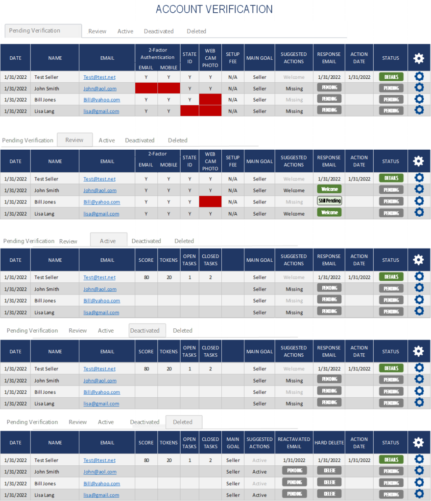 REVIEW The AVM has reviewed the account and notified the user what is pending or advance to the ACTIVE status. When a user update any of the required fields it will change their ID status from PENDING to REVIEW coming back to this page.